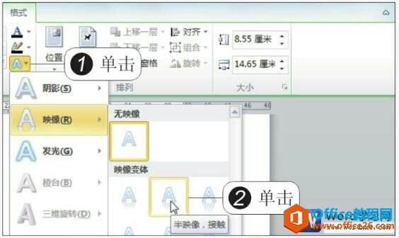 选中图表,切换到“图表工具”下的“格式”选项卡,单击“艺术字样式”组中的“文字效果”按钮,在展开的下拉列表中依次单击“映像”>“半映像,接触”选项,如下图5所示。