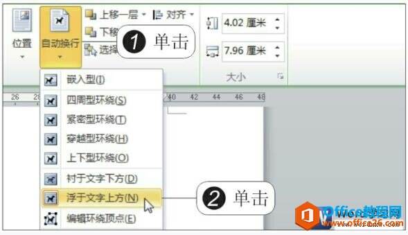 在“排列”组中,单击“自动换行”按钮,在展开的下拉列表中单击“浮于文字上方”选项,如下图7所示。