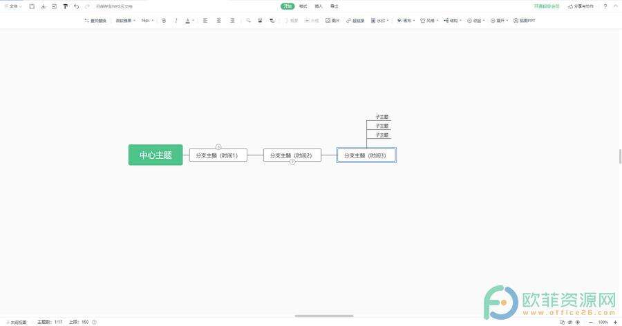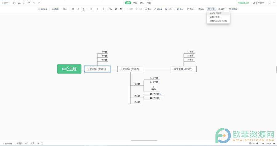 第三步:就可以看到所有的主题都被收起了,我们可以点击选中某一个主题,然后点击“展开”按钮,点击选择“展开子主题”;