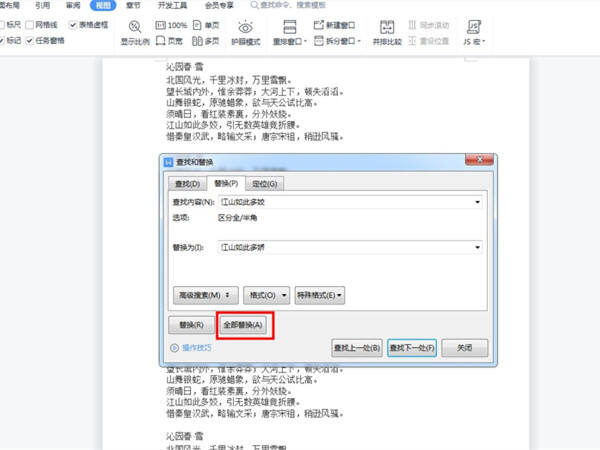 2、选择需要被替换的文本,输入替换文本,点击【全部替换】即可。