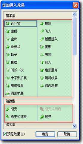 在打开“添加进入效果”窗口,选择一种“百叶窗”动画效果,单击 “确定”按钮完成设置。