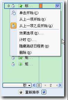 可以选择隐藏和显示高级日程表,在打开的高级日程表中,鼠标指向会出现上下或左右的双向箭头,按住就可以拖动,上下的双向箭头拖动可以调节动画的出现次序的先后,上下的双向箭头拖动可以调节动画的出现的时间及其长短。利用这个高级日程表可以清楚的观察各个动画的顺序和时间的分配情况,可以特别方便地修改设置的动画。