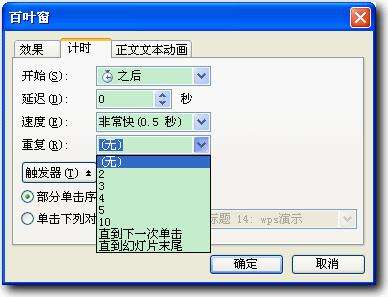 触发器部分,默认单击鼠标触发部分序列动画,勾选“单击下列对象是启动效果”,在其后面的下拉按钮处单击,悬着一项内容,单击“确定按钮”,就可以设置好触发器。