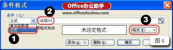 5、设置条件格式:选择C2到C8单元格,选择“格式|条件格式”菜单项,打开“条件格式”对话框。从“条件1(1)”下拉列表框中选择“公式”①,在其右边的框内输入“=$J$2=1”(数字1表示星期一)②,单击“格式”按钮③。