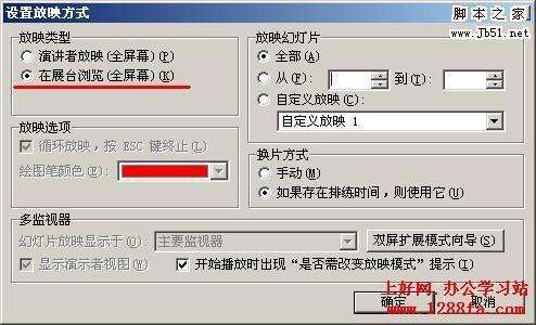 2、在“放映类型”中选择“在展台浏览(全展幕)(K)”。