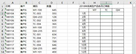 在这个表单数据中,并没有单独的一列来保存产品类别,也没有单独的一列来保存月份(尽管名义上A列是日期,但不是真正的日期),因此,如果要使用SUMIFS函数来求和的话,就必须把C列产品编码的左两位所代表的产品类别分离出来单独保存在一列里,把A列数据中间两位数字取出来转换为月份单独保存另外一列里,这样的操作显然违背了高效数据分析的基本原则。那么,我们能不能在不使用辅助列的情况下,使用一个综合公式来解决呢?答案是肯定的,就是使用SUMPRODUCT函数。