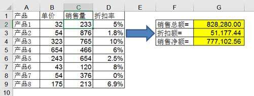 在这个例子中,利用SUMPRODUCT函数计算所有产品的销售总额、折扣额、销售净额的公式分别如下:
