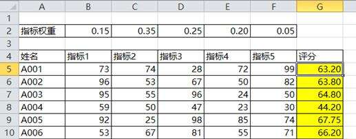 下图是一个评分表,有5个评价指标,每个指标的权重是不同的,现在要计算每个人的评分,而这些评分就是每个指标分数与指标权重相乘相加的合计数,也就是数学中的,那么,计算公式如下。
