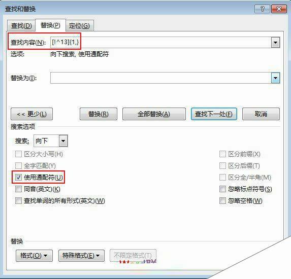 ②单击更多按钮之后,勾选使用通配符。在查找内容中输入: [!^13]{1,}