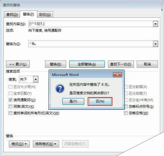 ④单击全部替换按钮,弹出下面的对话框,我们选择否。