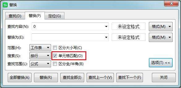 勾选单元格匹配,也就是说,替换的是单元格内只有零值的选项,勾选完毕后,单击全部替换。