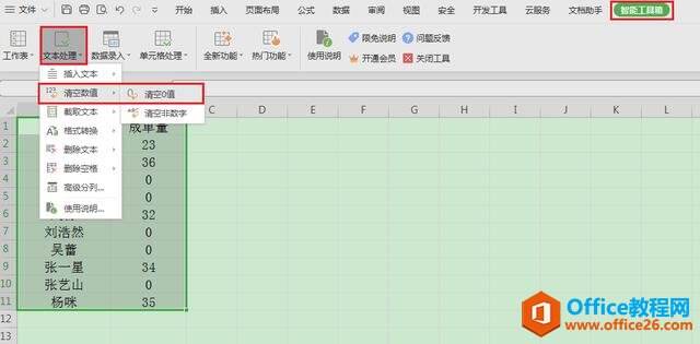 选中表格数据,单击智能工具箱,选择文本处理—清空数值—清空0值。