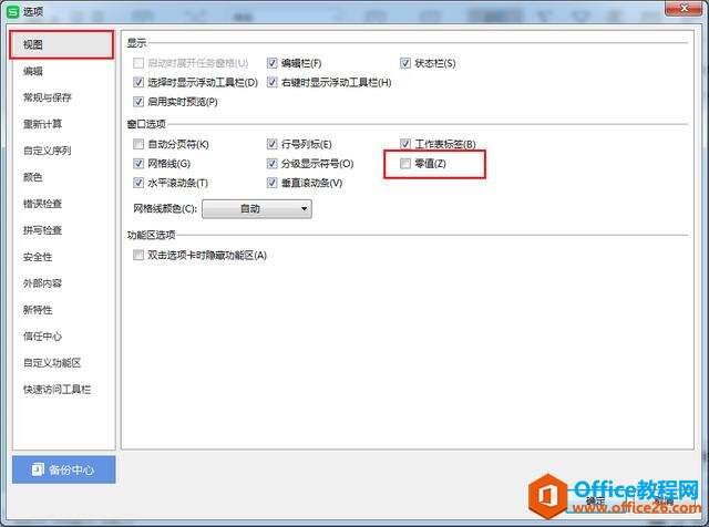弹出选项对话框,在视图下的窗口选项中,取消掉零值的勾选,单击确定。这样更改完毕后,不但之前的零值都去除掉了,而且再次输入零值也不会显示。