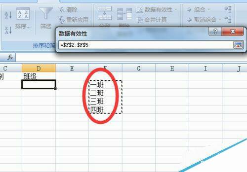 上面是以性别为例选择项只有两个男,女。如果是选择项比较多的,比如班级,就可以在表格中另外的一个区域里先输入一个列表。比如班级,先在另外区域做一个列表{一班 二班 三班 四班}