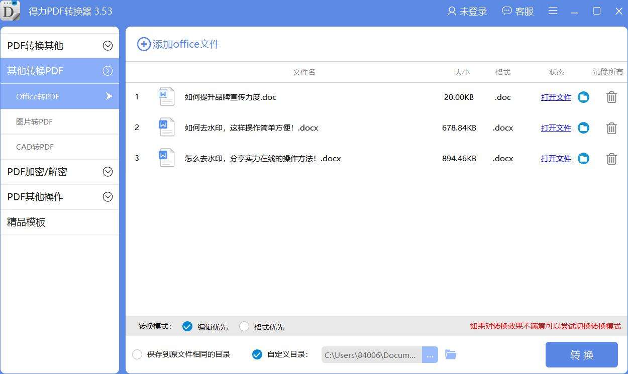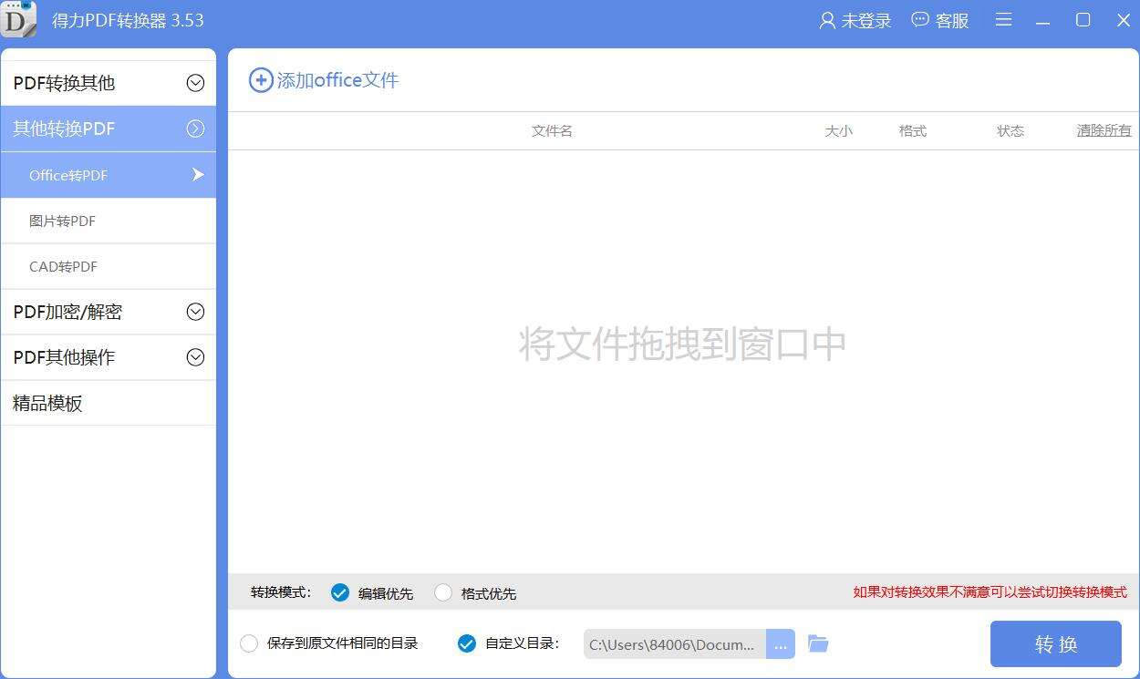 2、点击【其他转换PDF】功能,然后选择【office转PDF】,将文件添加或者拖入其中,点击【转换】。