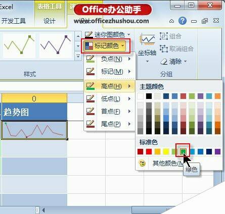 为了让图表中的最高值和最低值可以更好的区别开来,可以通过更改“标记颜色”来达到目的。单击“样式”选项组中的【标记颜色】按钮,然后将鼠标指向“高点”选项,在颜色库中选择合适的颜色,如“绿色”,鼠标单击目标颜色,即可完成更改。