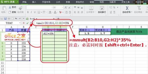 使用mmult函数计算浮动利润。mmult函数用于计算两个矩阵的乘积,我们可以在这种情况下使用。输入下图所示的函数公式。