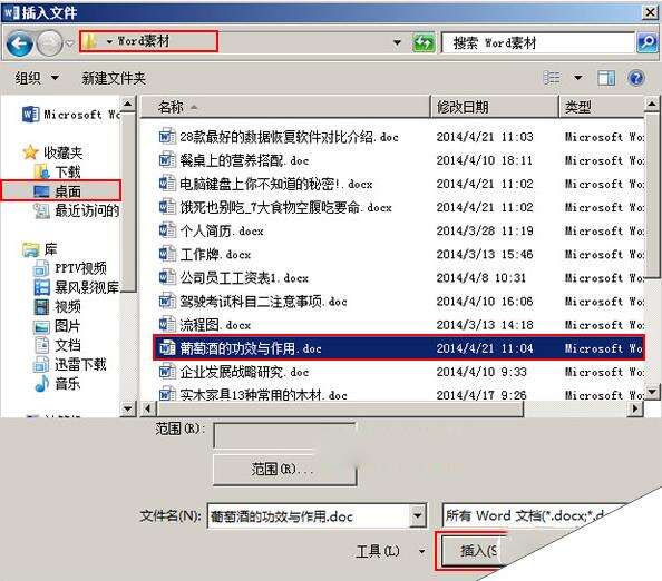 2.此时会弹出一个“插入文件”对话框,我们在合适的位置选中要插入的Word文档,可以按住Ctrl键同时选中多个文档,然后单击“插入”按钮。