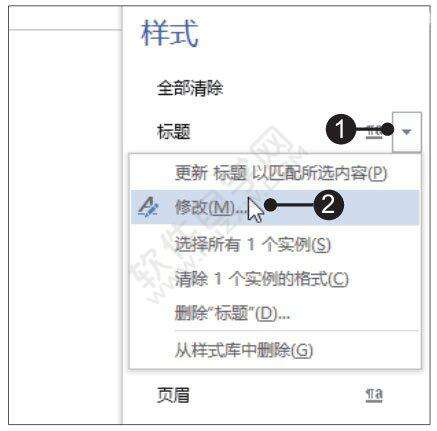 2、打开“修改样式”对话框。弹出“样式”窗格,将鼠标指针指向要修改的样式,然后单击该样式右侧的下三角按钮,在展开的下拉列表中单击“修改”选项,如图所示。