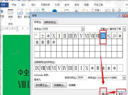 这里如果需要将所有的等级符号插入,点击选中一个,然后点击“插入”,点击完毕之后,点击“关闭”关闭插入窗口。