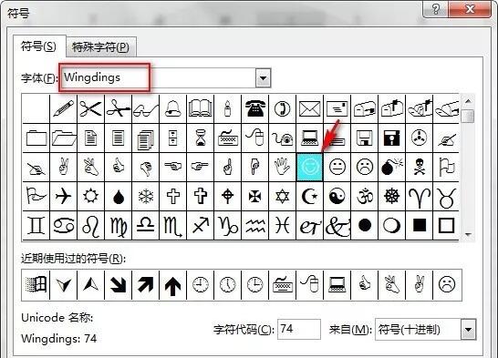 2.在弹出的“符号”对话框中,在字符下拉列表中选择“Wingdings”字体,然后在其下面找出笑脸符号,如下图2所示。