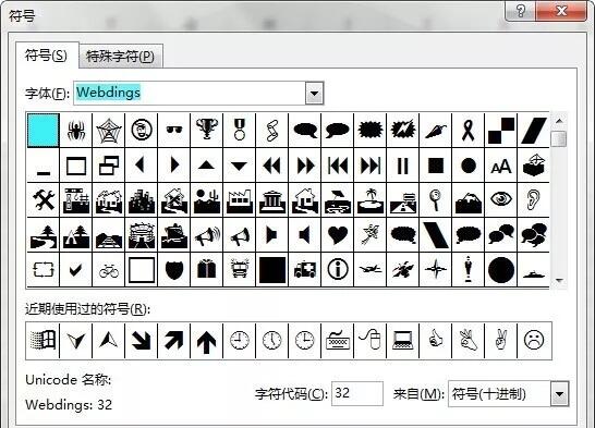 实际上,选择不同的字符,我们可以得到一些不同的特殊字符符号,如下图5所示,这是我们选择了“Webdings”字体后得到的一些字符符号。