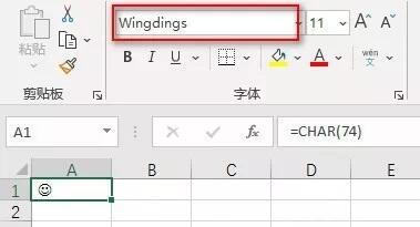 2.选择该单元格,设置其字体为“Wingdings”,如下图4所示。可以看到,单元格中变成了笑脸字符。