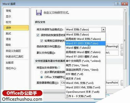 第2步,在打开的“Word选项”对话框中切换到“保存”选项卡,在“保存文档”区域单击“将文件保存为此格式”下拉三角按钮,并在打开的下拉菜单中选择“Word 97-2003文档(*.doc)”选项,并单击“确定”按钮,如图所示。