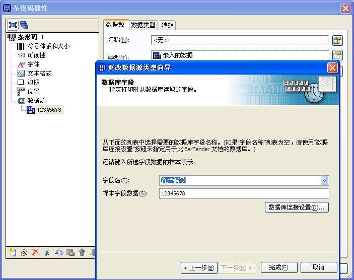 打开BarTender软件,创建一个条码,双击条形码,弹出【条形码属性】对话框,点击【数据源】——【数据库字段】,