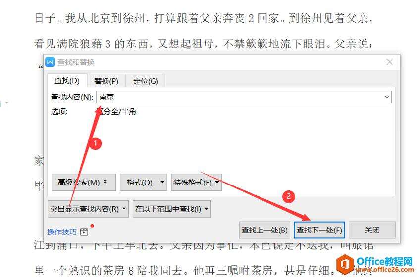 输入需要查找的字“南京”,点击查找下一处,如下图所示: