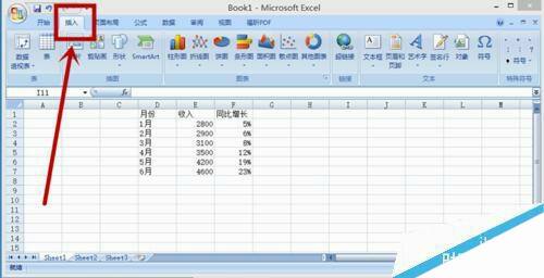 在excel工作表上方的菜单中,点击”插入“,如下图。