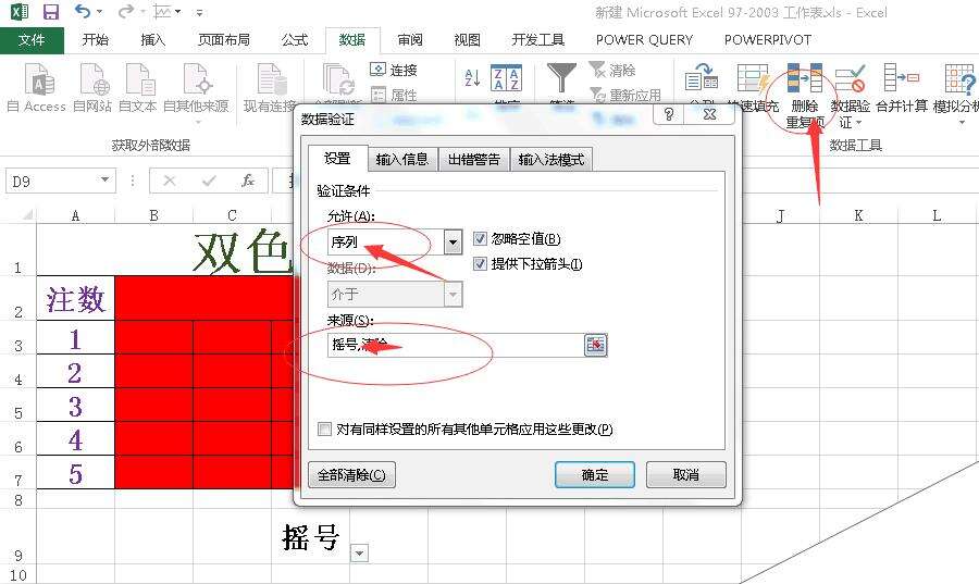 2、然后在D9的摇号做一个数剧数据下拉列表。图1,点击数据-数据验证(或者叫数据有效性)-序列,在来源里写(摇号,清除),点击确认。图2就是我们要的效果
