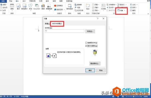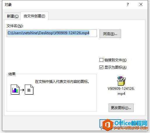 然后点浏览选择要插入的MP4视频文件,选择显示为图标: