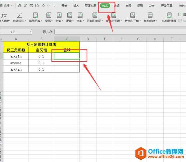 选中需要计算的单元格,然后在菜单栏处找到【公式】选项按钮,如图所示,我们先选中计算反正弦函数对应的值;