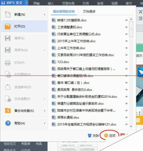2、在点击【WPS文字】按钮后弹出的菜单下,点击选择【选项】。(如图所示)