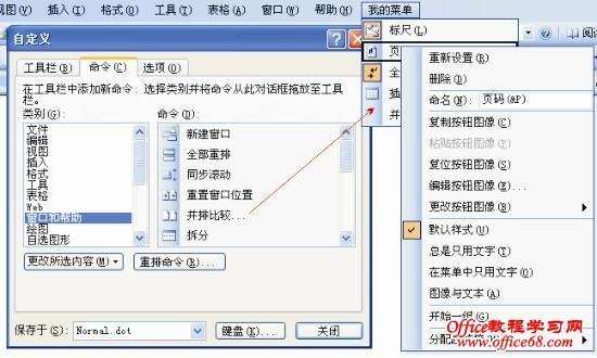 3.为新菜单插入命令。在自定义窗口的“命令”选项左侧的“类别”中选择命令的类别,然后在右侧的“命令”中找到要插入的命令,用鼠标将该命令拖放到新建的菜单下方的方框中,并重复此操作添加其它命令,如下图所示