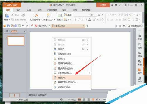 2、在打开的Wps文稿窗口,在编辑区域点击鼠标右键,在弹出的选项框中,点击“背景”选项。如图所示;