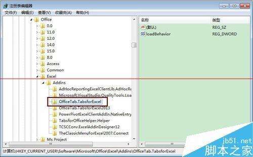 4、再次定位到HKEY_CURRENT_USER/Software/Microsoft/Office节下,重复步骤3(删除Excel节下的OfficeTab.TabsforExcel)