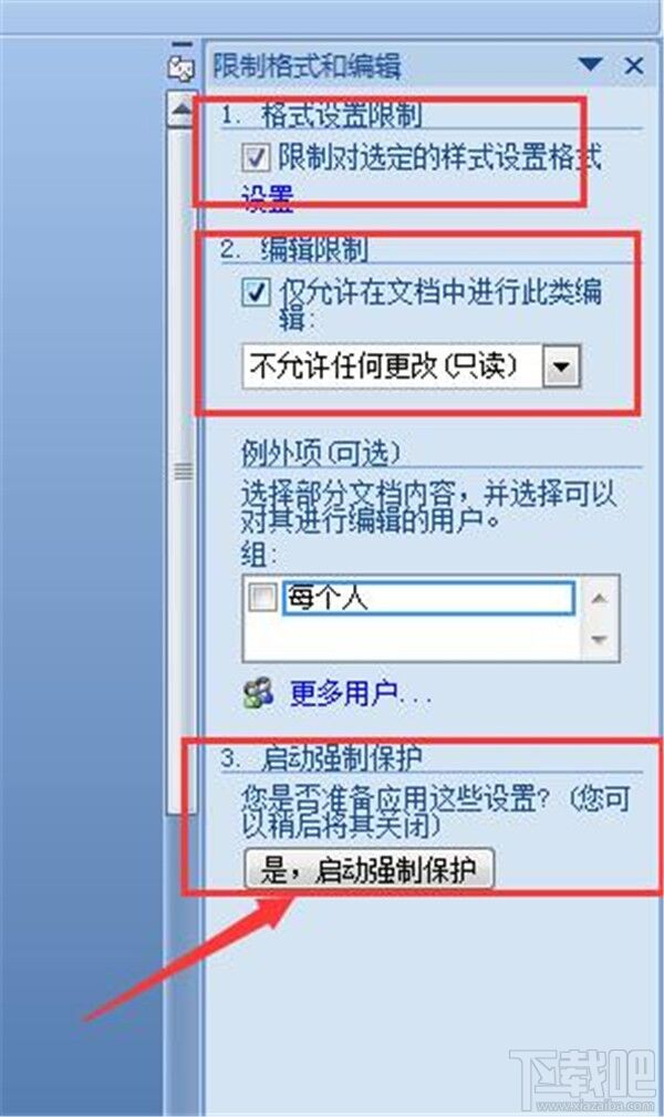 5、勾选“仅允许在文档中进行此类编辑”,在下拉列表中选择“不允许任何更改(只读)”;