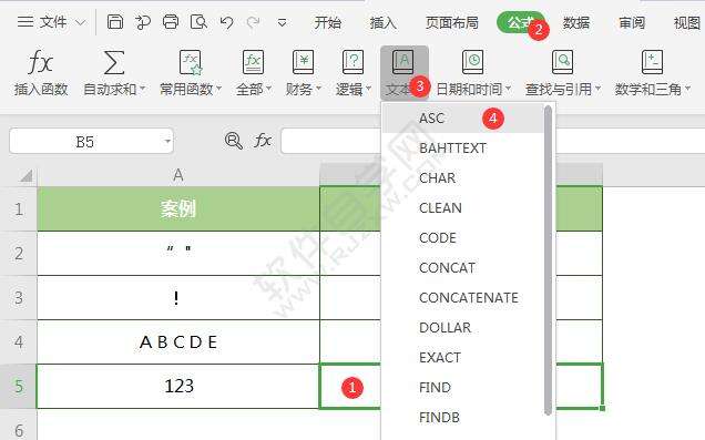 2、点击插入单元格,点击公式菜单–点击文本函数–点击ASC函数。效果如下: