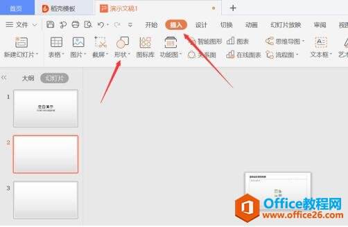 在工具栏点击【插入】,在下拉工具栏中选择【形状】,形状要覆盖掉原来页面;