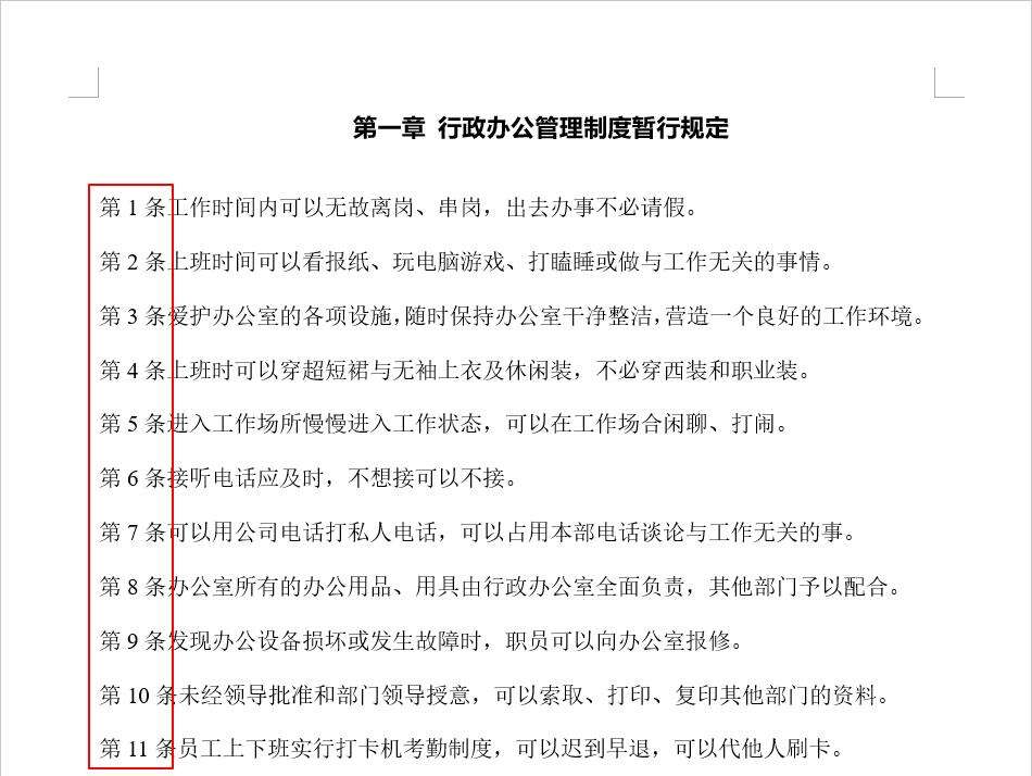 Step1:按住Alt键,拖动鼠标,竖向选中条例前的手动编号。然后键删除。