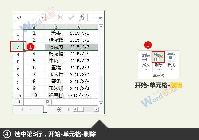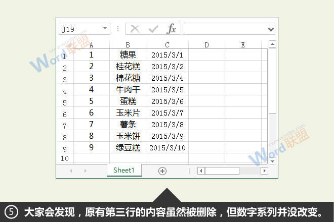 5.你会发现,虽然原来第三行的内容已经被删除,数字系列没有改变。