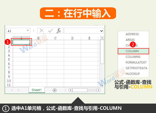 1.选择单元格A1,公式-函数库-查找和引用-列。