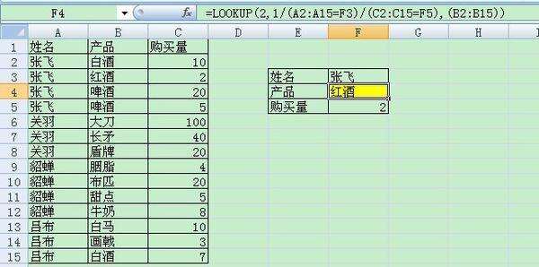 =LOOKUP(2,1/(A2:A15=F3)/(C2:C15=F5),(B2:B15))