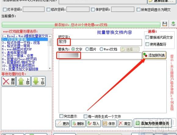 5.点击这个添加到列表选项之后,在处理任务列表界面就可以看到这个设置好参数的替换文字任务了,我们点击右下角的添加为待处理任务这个选项。