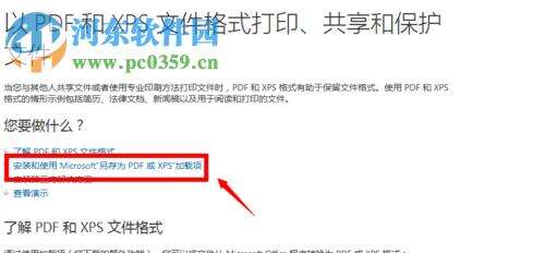 3、随后会弹出其他文件格式的加载项界面,我们在其中找到“以PDF和XPS文件格式…”这一栏,然后我们点击“安装和使用Microsoft另存为PDF或XPS加载项”。
