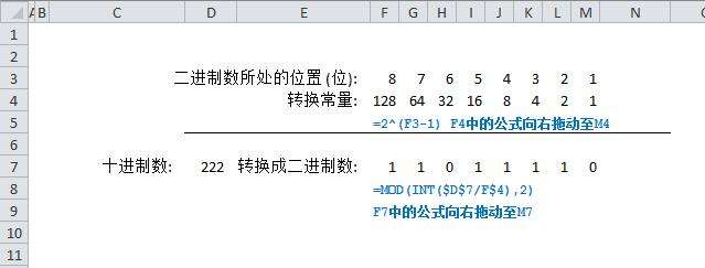 下图1演示了在Excel工作表中使用公式将十进制数222转换成二进制数11011110的过程。