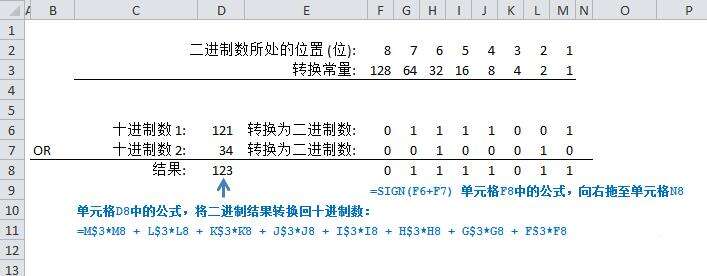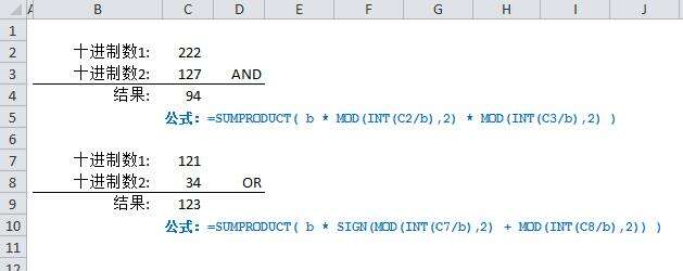 使用SUMPRODUCT函数与上面的公式相结合,可以省去上面介结的一些中间步骤,即在一个公式中就将二个十进制数转换成二进制数,将它们“按位与”或者“按位或”,最后将位运算的结果转换成十进制数的结果。