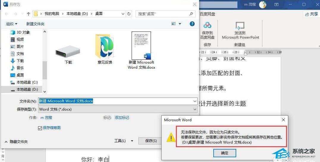 当我们修改word文档后,保存时word会提示我们该文档为只读模式不可修改。